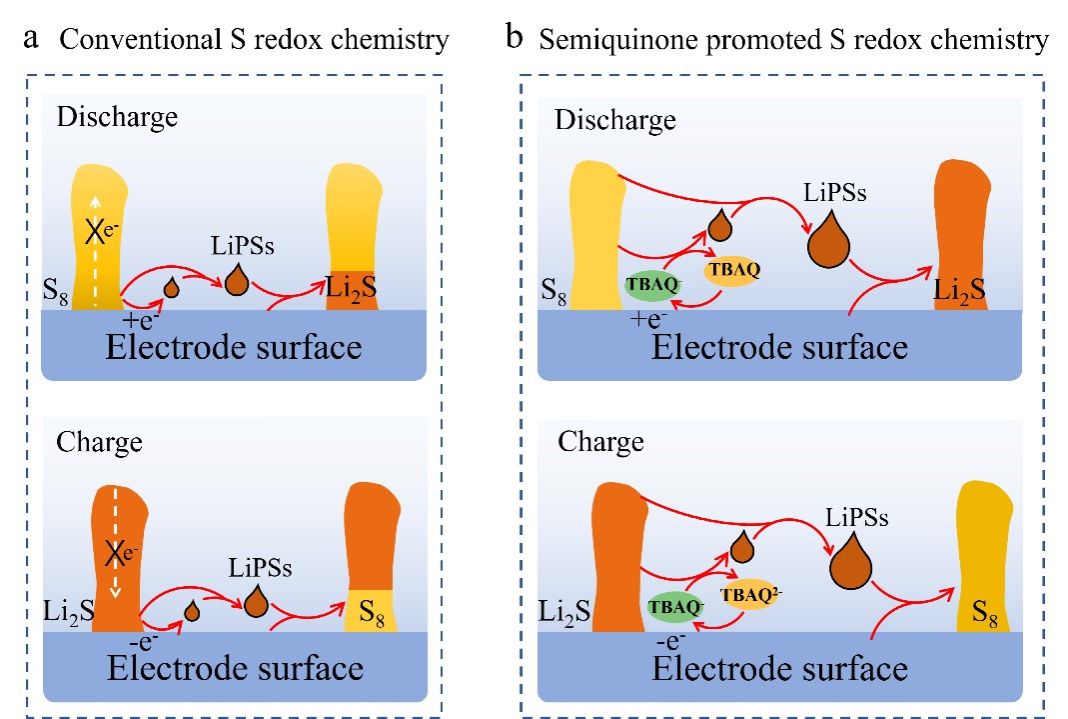 (图1 a)传统远程电子转移受限的固-液-固(SLS)反应路径;b)半醌(TBAQ•−)作为双功能催化剂构建的长程电子转移能力的SLS反应途径。